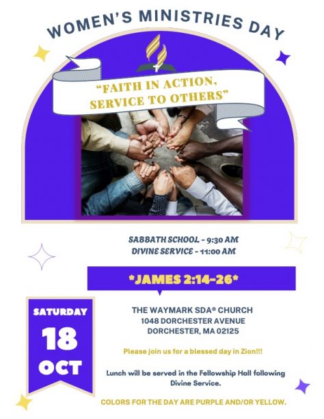 Mark your calendars and join us for a special Women's Ministries Day! This year we are celebrating the theme, "Faith in Action, Service to Others." The day will be filled with inspirational praise moments, uplifting worship, and precious time connecting with one another. Your presence is a wonderful way to show your support. Come, Be Encouraged and Celebrate with Us. Lunch will be served.