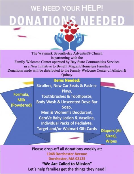 This initiative is still ongoing. You can make donations of the listed items by dropping them off at the church every week. All clothing and food donations will be sent to the Family Welcome Center in Quincy and Allston. Please see the attached flyer for donation ideas.