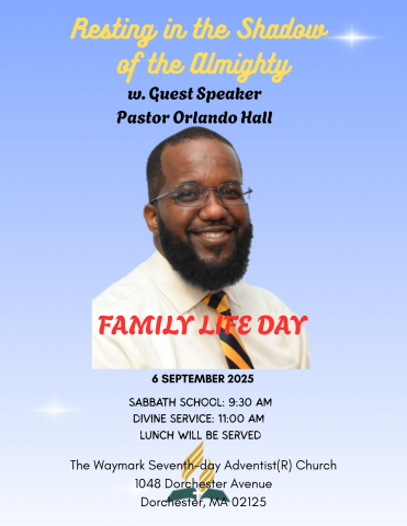 You are invited to Family Life Day. Join us for an encouraging and uplifting word, "Resting in the Shadow of the Almighty" w. guest speaker Pastor Orlando Hall. Lunch will be served after the service. Invite your family and friends and let's worship together in the Spirit of Holiness.